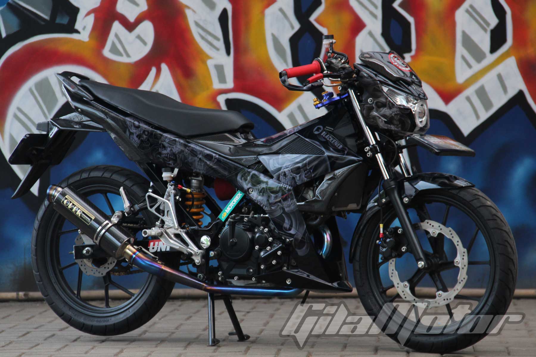 “Konsepnya sih fashion daily use, karena motor ini memang dipakai untuk harian. Kalau soal pemilihan motif tengkorak itu karena saya seneng yang begitu. Kan banyak tuh Suzuki Satria F150 yang dimodif dengan warna-warna yang saling bertabrakan. Nggak enak banget dilihatnya, saya nggak mau seperti itu,” ungkap pria nyentrik tersebut seraya menawarkan kopi kepada Bang Gilmot.