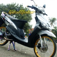 Sebagai finishing, bodi kelir abu-abunya dibalut cutting sticker bermotif Mio Limited Edition. “Sedangkan mesin dipermak dengan aplikasi piston 58mm. Biar larinya nggak malu-maluin,†pungkasnya.