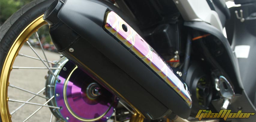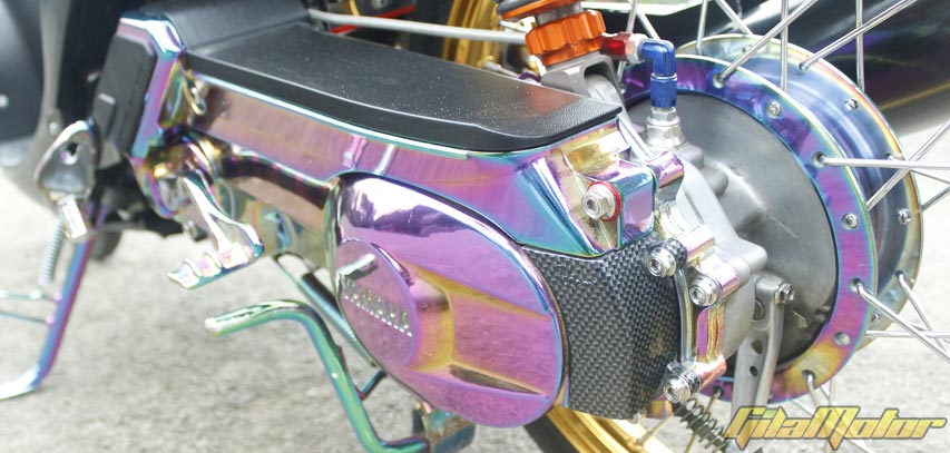 Agar makin segar, beragam komponen orisinal dilapis krom pelangi yang nampaknya bakal jadi tren modifikasi 2015. “Kecuali blok CVT yang diganti milik Nouvo, tapi tetap dengan lapisan krom pelangi,†beber Reky.