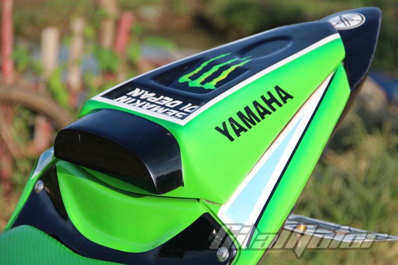 Memang, alih-alih melabur seluruh bodi dengan warna biru serta livery khas Yamaha di ajang MotoGP. Sekujur bodi sepeda motor lansiran 2015 ini justru berwarna hijau cerah yang identik dengan pabrikan sebelah. Gilmoters tentu tahu dong.
