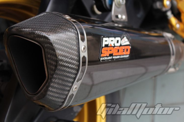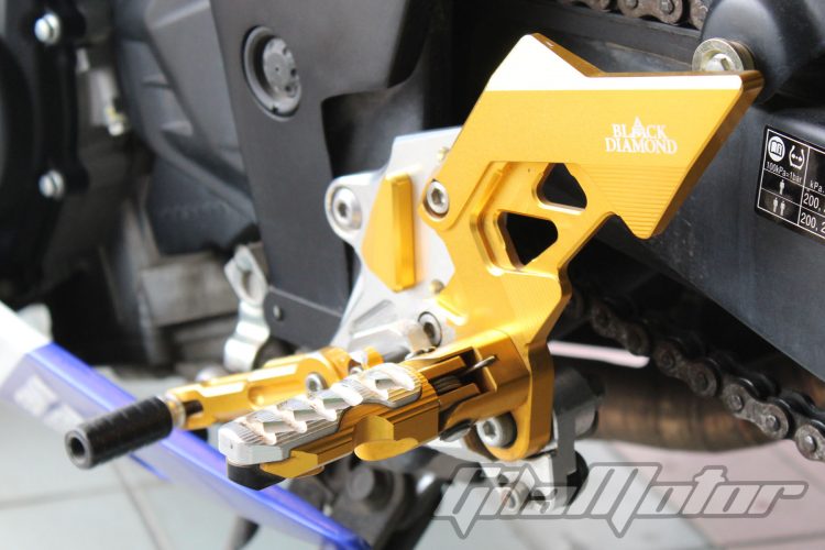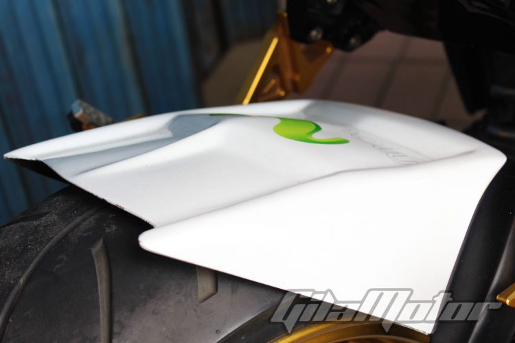 Selain bermain kelir dan grafis, Sentral Variasi juga memasang beberapa part aftermarket guna menunjang penampilan Yamaha R25 gacoanya Gilmoters. Coba saja tengok, footstep, knalpot hingga setangnya.