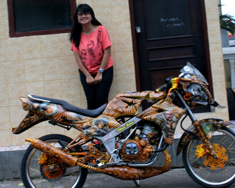 Muncul versi L, malah jadi buruan para pecinta modifikasi seperti lelaki yang dekenal dengan sapaan Konde ini. “Iya nih bang, Ninja tiada habis en label kenceng ada di sana,†seru salah satu crew Rizqy Brush ini.