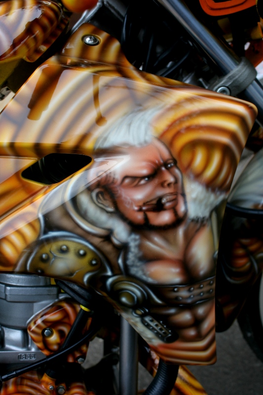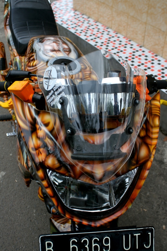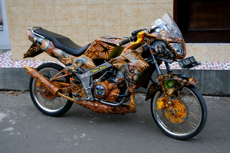 Jika kebanyakan modifikasi airbrush mengambil tema mirip tribal blade dengan warna scotlight, tapi Konde nggak mau sama dengan tema itu. Doi milih motif realis bertema warcraft salah satu game online yang lagi populer saat ini. Tidak terlalu realis sih, tapi condong animasi dengan dominan warna coklat gothic dari bahan Nippon yang dioplos dengan Top Colour.