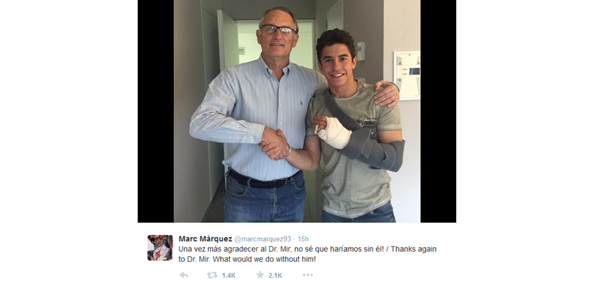 Marquez langsung mendapatkan penanangan dari Dr. Xavier Mir, Head of the Unit for Hand and Upper Extremities Pathology di Hospital Universitario Quiron Dexeus di Barcelona, Spanyol.