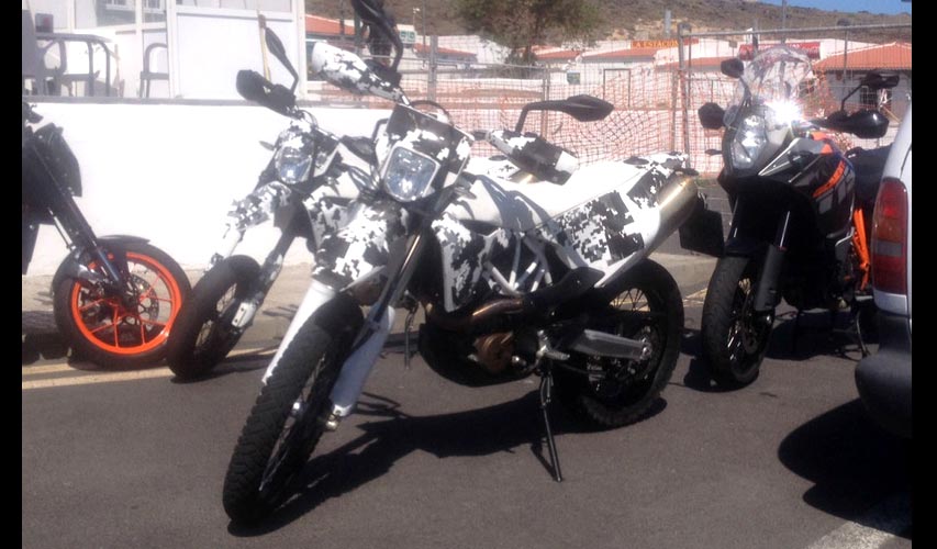 Seperti gambar di atas, yang menampilkan dua prototipe dengan kamuflase berat waarna putih-hitam. Namun sosok supermoto khas 701 tetap jelas dikenali, terutama dari bentuk headlamp, sasis turbular besar dan bodi gambot di bagian belakang.