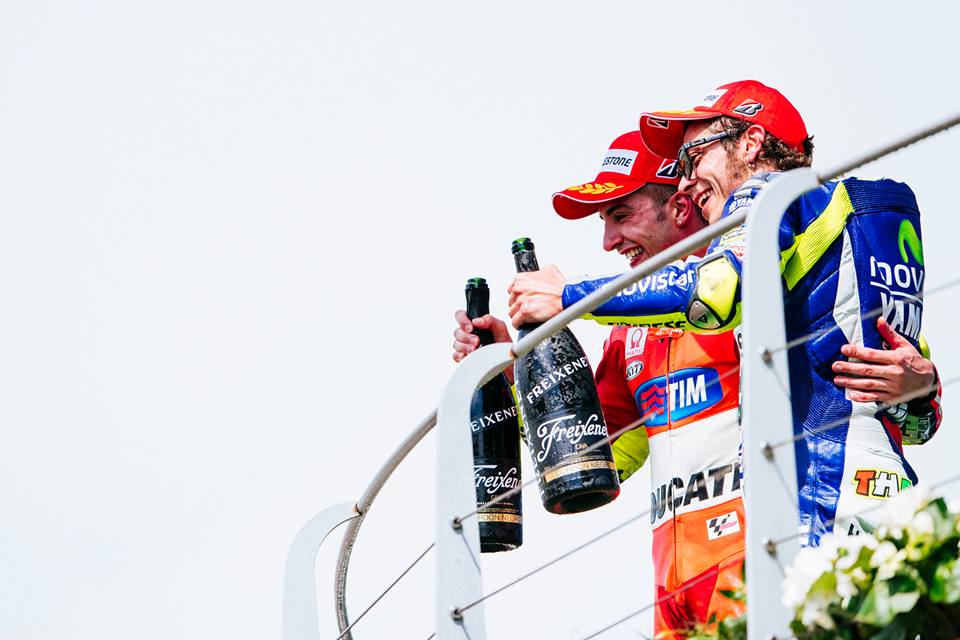 Di foto itu Iannone dan Rossi saling merangkul erat di atas podium Mugello sambil mengangkat botol sampanye ke arah penonton. Iannone adalah pebalap pertama yang melakukannya.