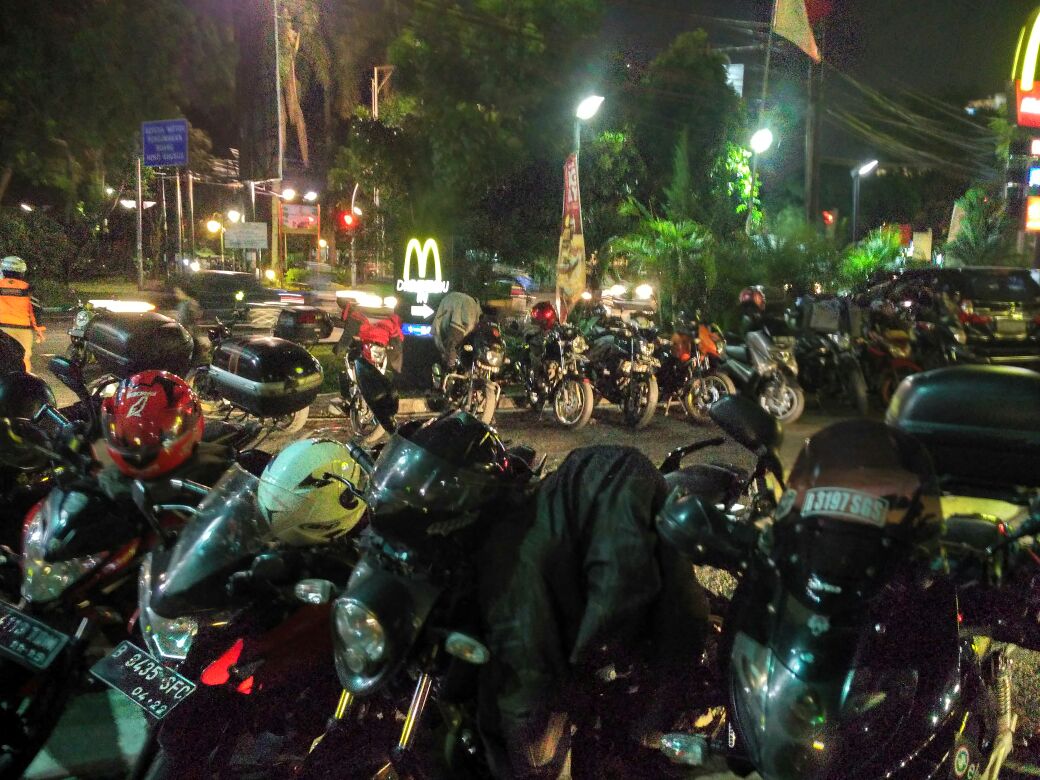 Duduk lesehan, deru knalpot kendaraan yang lalu lalang menambah keseruan obrolan malam, bak sahabat yang sudah lama tidak bersua berkumpul melepas rindu. Dari ngobrolin modifikasi motor, rencana touring, hingga destinasi wisata. Udara yang semakin dingin, menambah kuat ‘sinyal’ perut yang segera di isi, sate maranggi di sekitar Puncak Bogor menjadi pelengkap acara rolling.