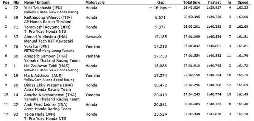 Hingga finish, Yudhis pun tak lepas dari kejaran rider Jepang, Yuki Ito yang harus puas finish ke-5. Pebalap Indonesia lainnya, Dimas Ekky Pratama finish ke-9 dan Andi Gilang ke-11. Sementara Rafid Topan terjatuh di lap terakhir tepat di tikungan terakhir.
