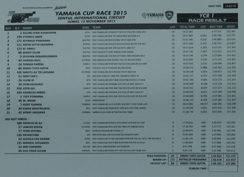 Hasil race final Yamaha Cup Race YCR1, Sentul :