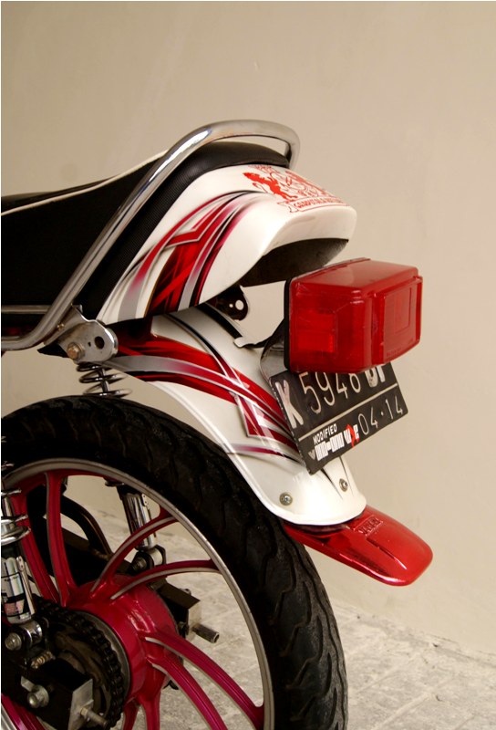 Paduan warna motornya pun diselaraskan dengan warna seragam anak-anak didiknya, yaitu putih merah. Nah, Adjie pun sedikit memberi sentuhan warna merah pada bagian tangki, buritan dan rangkanya.