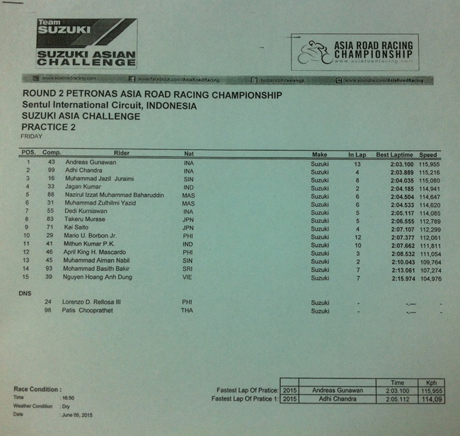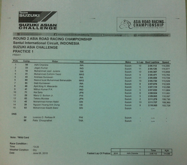 Hal tersebut dibuktikan ketika mereka melakoni FP1 dan FP2, Jum’at (5/6/2015). Sesi pertama menjadi milik Adhi Chandra dimana dirinya mampu mencetak lap time 2 menit 05,112 detik.