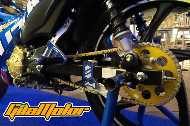 “Beberapa ubahannya lebih kepada unsur safety seperti handle guard, chain guard dan foot step racing biar nggak mentok saat menikung.” jelas Widjang. Selain itu, penggantian part hanya terjadi pada knalpot yang sudah diganti merek HRP serta rem depan dengan kaliper Nissin.
