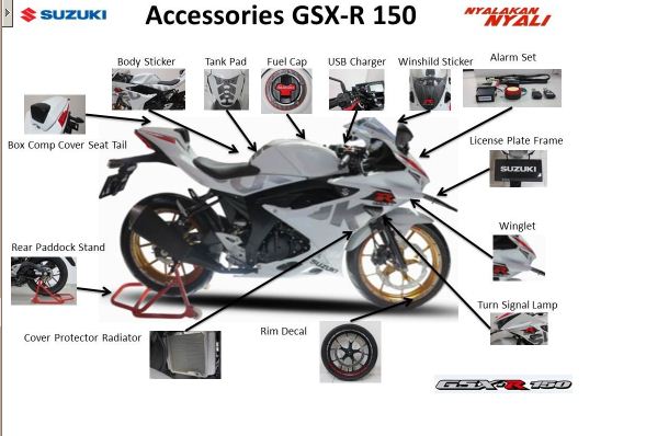 Terhitung terdapat 13 item yang disediakan pabrikan yang terkenal dengan logo s besar tersebut bagi para pemilik GSX-R150. Item yang ditawarkan pun beragam loh Gilmoters. Tidak hanya untuk menambah ketampanan namun juga dari segi fungsionalitas.