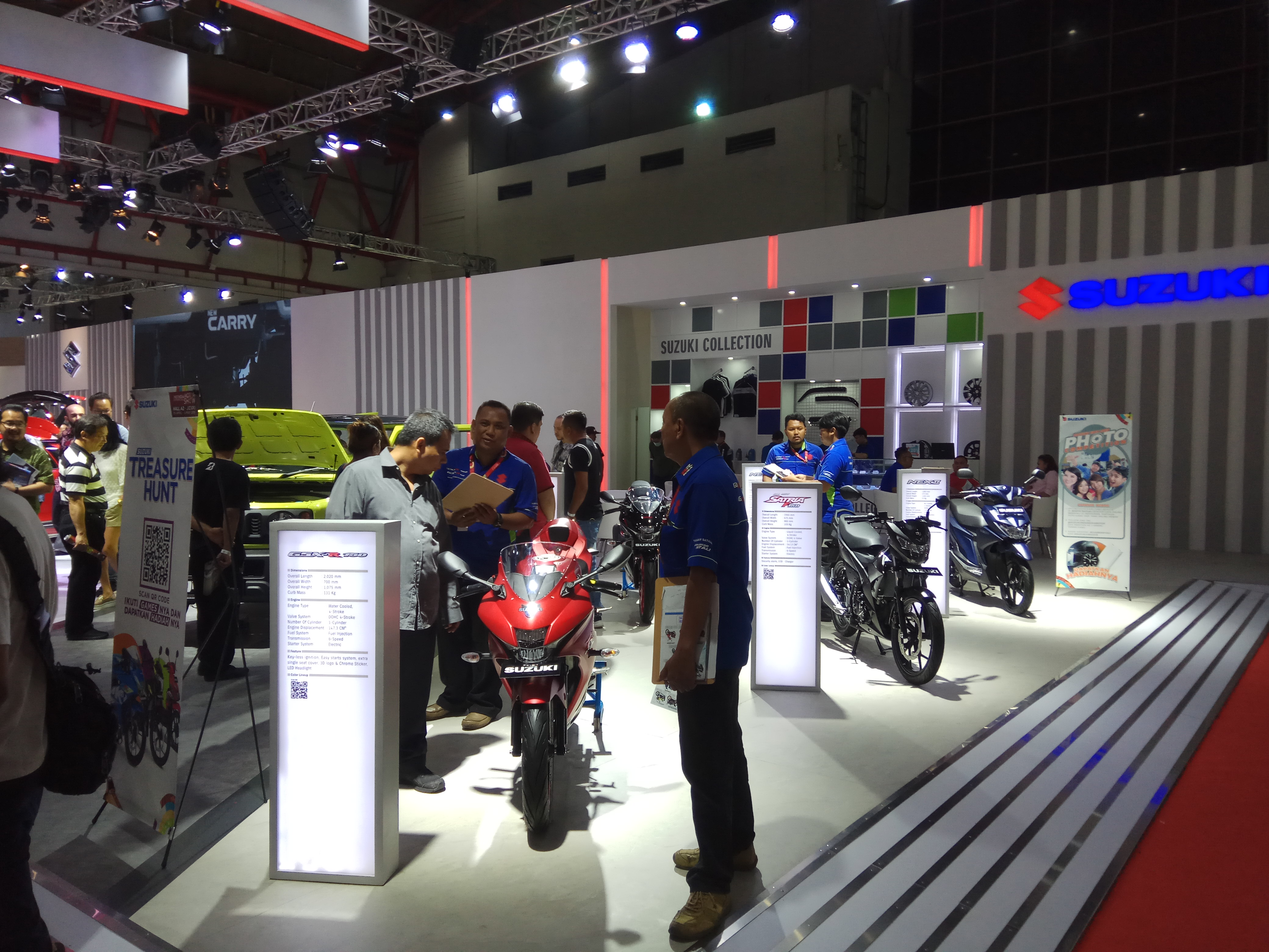 Bersanding dengan mobil-mobil Suzuki, SIS memajang sepeda motor Suzuki GSX-R150 Matte Red Edition, GSX-R150 ABS, All New Satria F150 dan NEX II Elegant Premium yang saat ini merupakan tipe-tipe yang paling dicari oleh publik di Tanah Air. Selain itu pengunjung juga dapat menemukan promo-promo menguntungkan khusus untuk tipe GSX-R150 Shuttered Key dan GSX150 Bandit.