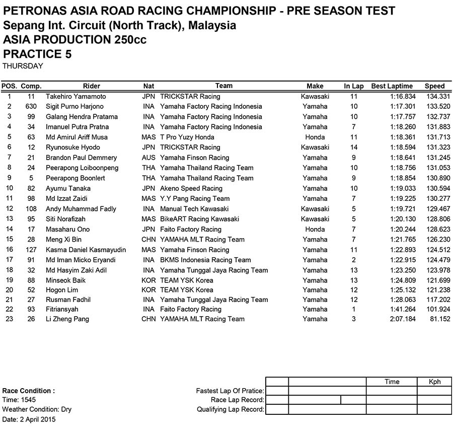 Sedangkan pebalap tuan rumah, Md Amirul Ariff Musa melengkapi daftar lima pebalap tercepat di latihan terkahir hari kedua. Tes l;anjutan akan kembali dijalani seluruh pebalap kelas AP250 dan juga SS600 hari ini.