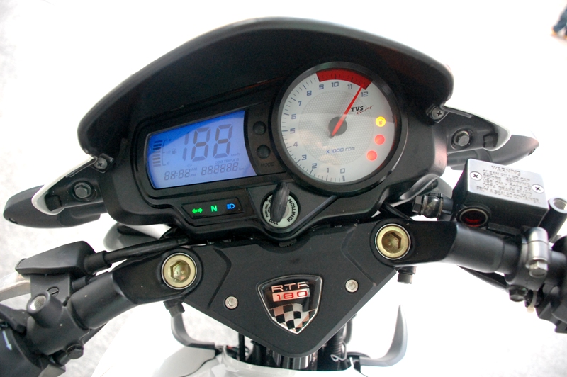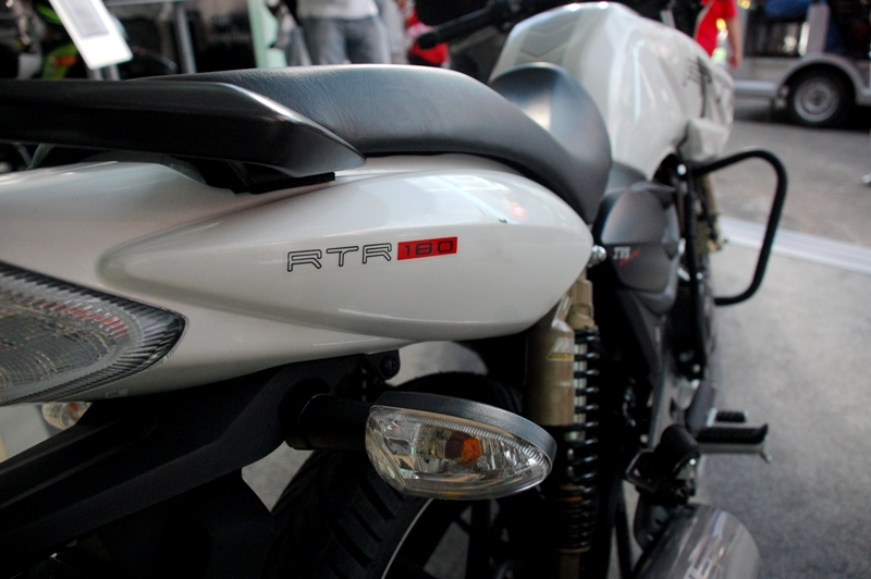 Secara tampilan, RTR 180 berbalut cat putih ini tak jauh berbeda dengan RTR 160 Dual Disc terdahulu. Hanya saja RTR 180 ini tampil dengan nuansa disain India dengan penambahan engine guard. Selain engine guard, warna dan motif tampilan combination meter yang terlihat lebih cerah dengan motif sarang lebah ditengahnya. Selebihnya tak terdapat perbedaan yang mecolok kecuali tlisan RTR 180 pada bodi nya.