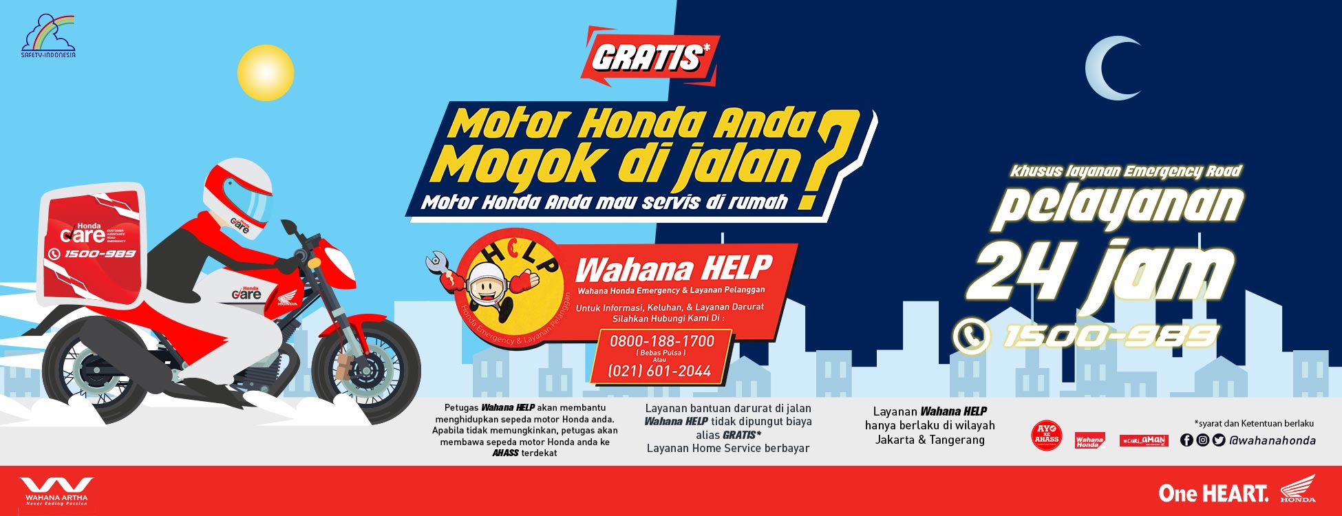 Layanan Wahana ini dinamakan Honda Emergency dan Layanan Pelanggan (HELP) dipastikan akan tetap beroperasi sepanjang masa liburan tahun baru 2020 Gilmoters. Layanan ini diberikan untuk konsumen Honda khususnya yang mengalami ganguan teknis dijalan Jakarta dan Tangerang layanan ini terbuka selama 24 jam.