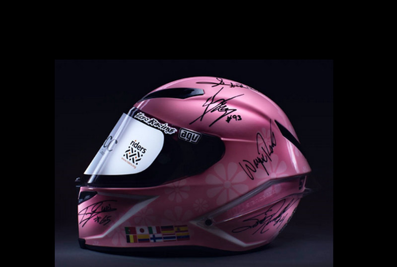 Hasilnya, helm warna pink keluaran AGV ini penuh dengan tanda tangan 12 pebalap jawara MotoGP dari berbagai jaman dengan total 58 gelar.