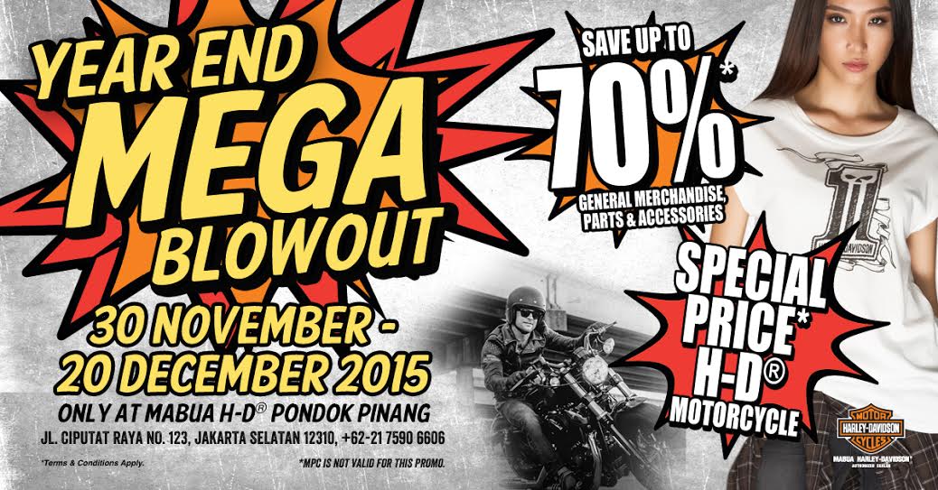 GILAMOTOR.com – Jelang tutup tahun 2015 Mabua Harley-Davidson gelar program Year End Mega Blowout, yakni diskon asampai 70% untuk pembelian genuine merchandise serta parts dan aksesori. Program tersebut berlangsung mulai 30 November hingga 20 Desember 2015.